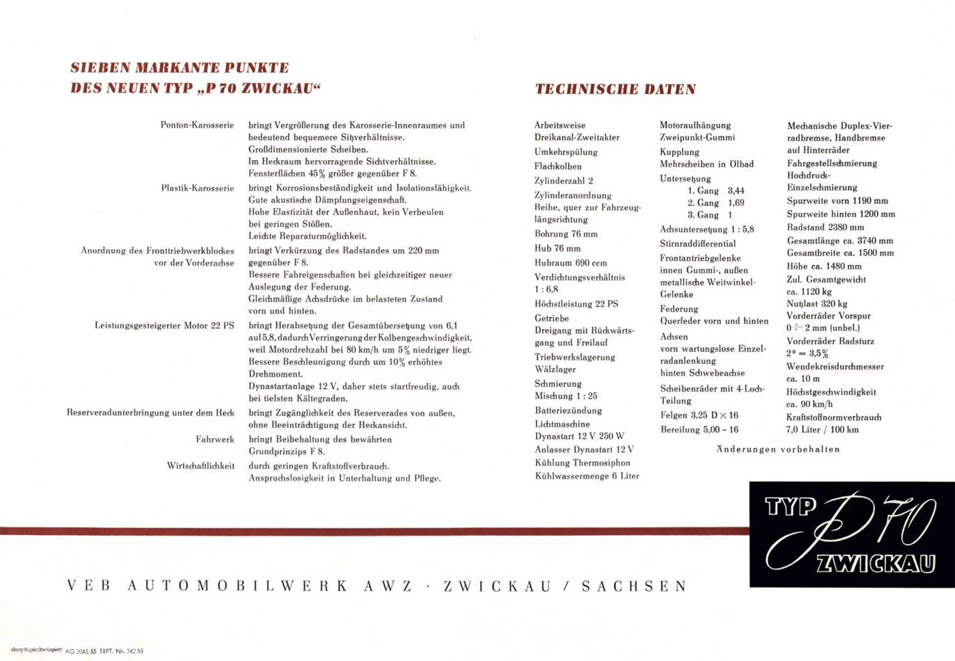 (Quelle: VEB Automobilwerk AWZ Zwickau, 1955. Achtung! Alle Angaben sind ohne Gewähr! Für Fehler und den aus deren Nutzung resultierenden Schäden wird keine Haftung übernommen. Die kommerzielle Nutzung ist ausdrücklich untersagt.)