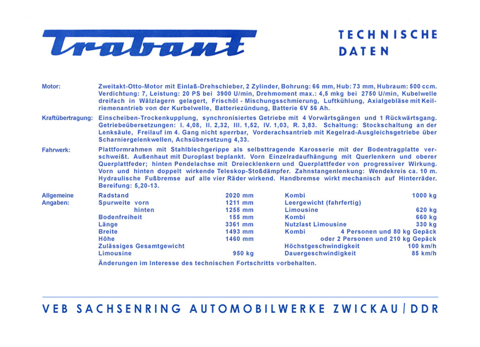 (Quelle: VEB Sachsenring Automobilwerke Zwickau, 1962. Achtung! Alle Angaben sind ohne Gewähr! Für Fehler und den aus deren Nutzung resultierenden Schäden wird keine Haftung übernommen. Die kommerzielle Nutzung ist ausdrücklich untersagt.)