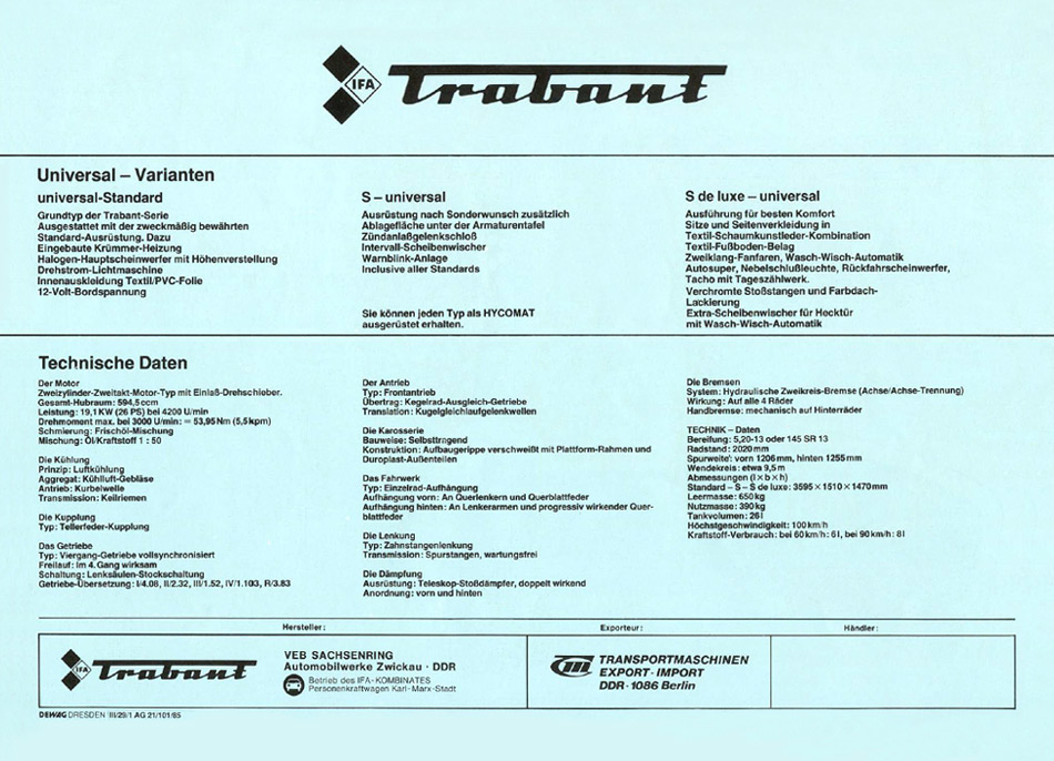 (Quelle: VEB Sachsenring Automobilwerke Zwickau, 1985. Achtung! Alle Angaben sind ohne Gewähr! Für Fehler und den aus deren Nutzung resultierenden Schäden wird keine Haftung übernommen. Die kommerzielle Nutzung ist ausdrücklich untersagt.)