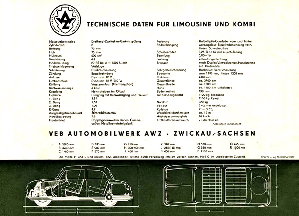 (Quelle: VEB Automobilwerk AWZ Zwickau, 1956. Achtung! Alle Angaben sind ohne Gewähr! Für Fehler und den aus deren Nutzung resultierenden Schäden wird keine Haftung übernommen. Die kommerzielle Nutzung ist ausdrücklich untersagt.)