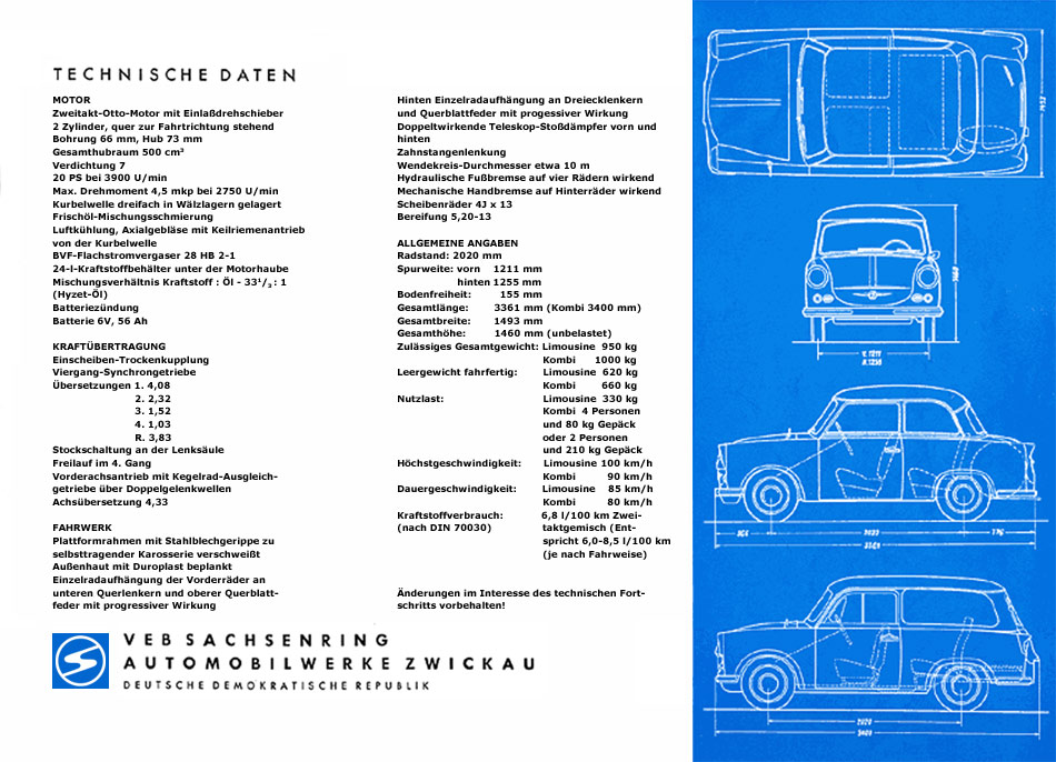 (Quelle: VEB Sachsenring Automobilwerke Zwickau, 1962. Achtung! Alle Angaben sind ohne Gewähr! Für Fehler und den aus deren Nutzung resultierenden Schäden wird keine Haftung übernommen. Die kommerzielle Nutzung ist ausdrücklich untersagt.)
